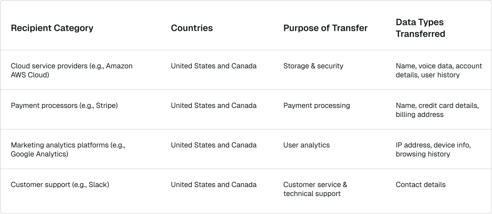6.1. Our Services are hosted in the US and Canada. This means we may transfer your Personal Data outside your country, state, or province of residence, depending on your location at that time. Regardless of your location, all Personal Data may be transferred to Canada and the United States for storage.