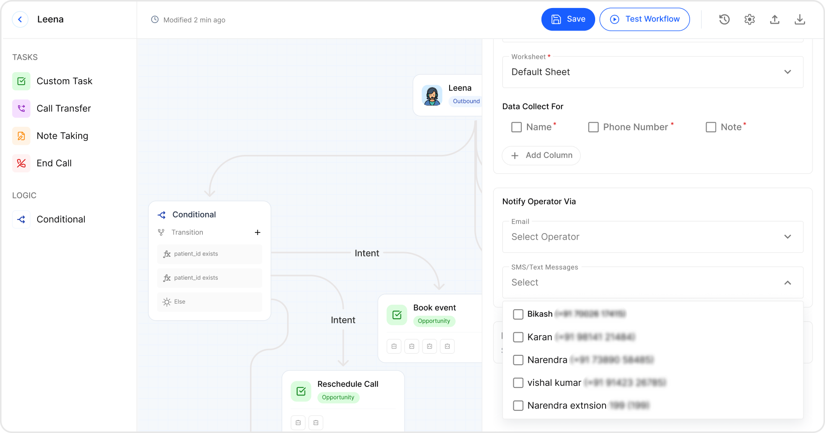 The account admin configures AI agent workflows in the Agent Builder. Under "Notify Operator Via → SMS/Text Messages," they select which operators should receive SMS notifications. Only operators who have provided their phone number (with consent in Step 1) appear in this list. No SMS is sent unless the operator is explicitly checked and the workflow is saved.