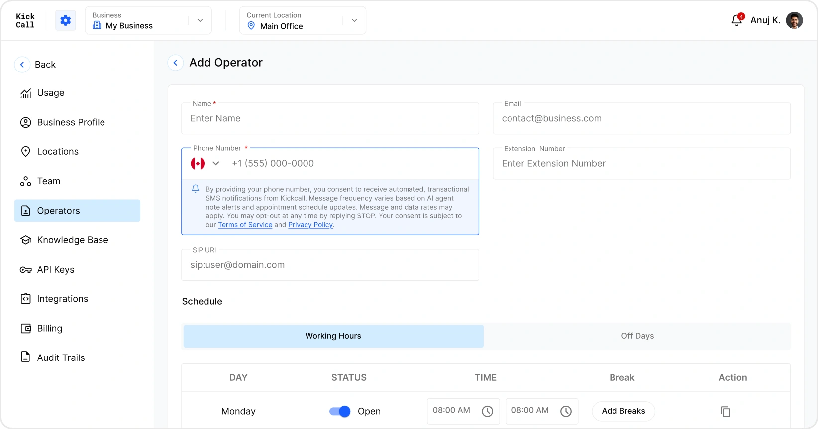 "By providing your phone number, you consent to receive automated, transactional SMS notifications from Kickcall. Message frequency varies based on AI agent note alerts and appointment schedule updates. Message and data rates may apply. You may opt-out at any time by replying STOP."