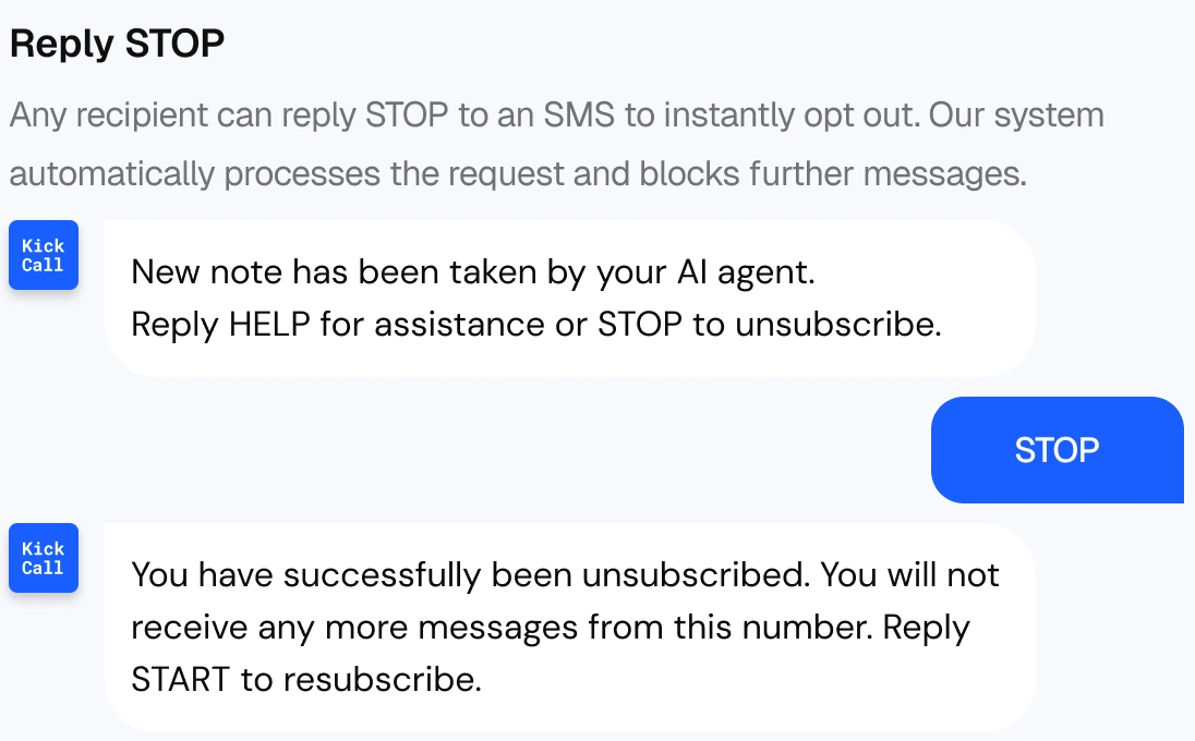 Kickcall ensures full A2P compliance by collecting explicit consent before sending any SMS. Here's exactly how our opt-in and opt-out process works.