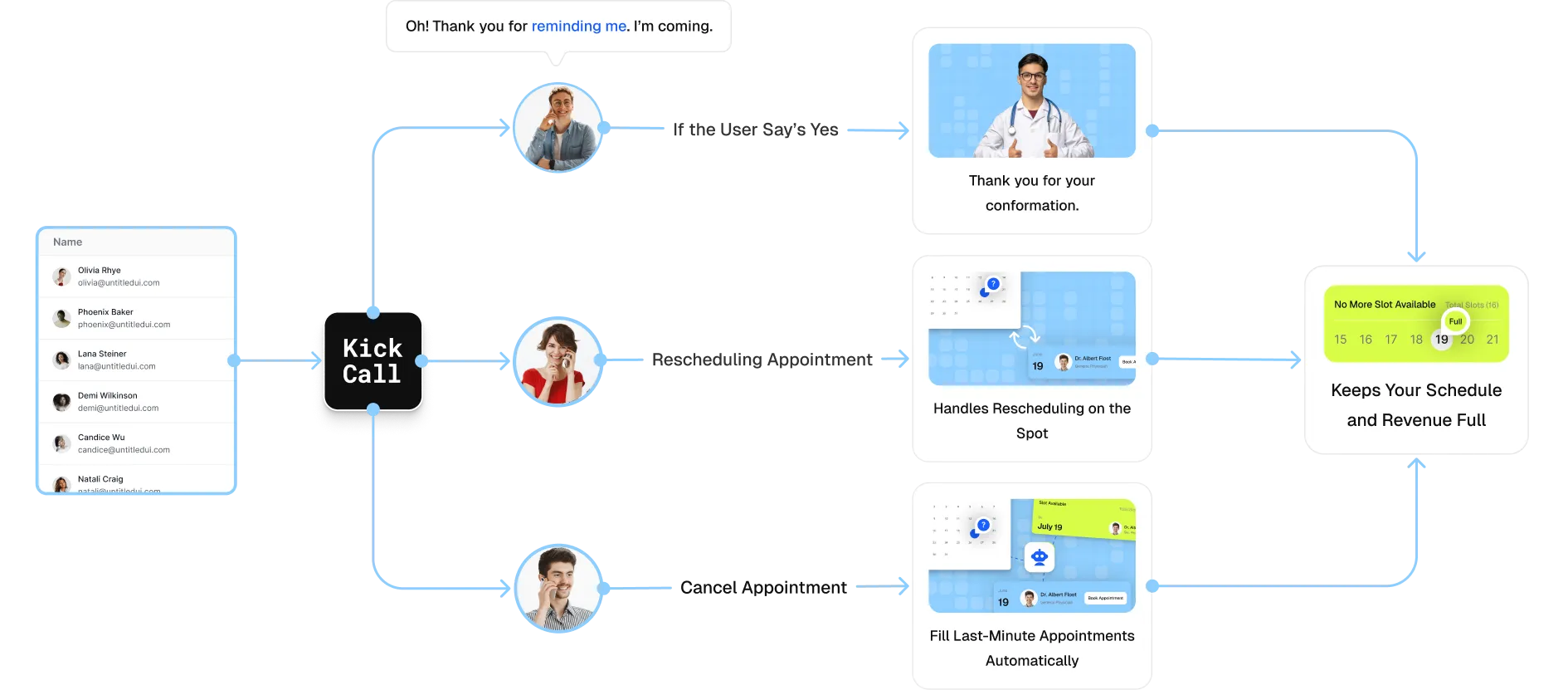 KickCall automates reminders and rescheduling — so patients show up, and your schedule stays full.
